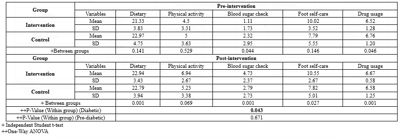 Table 2. Comparison of the scores of self-care components in the patients with diabetes and pre-diabetes before and after the intervention