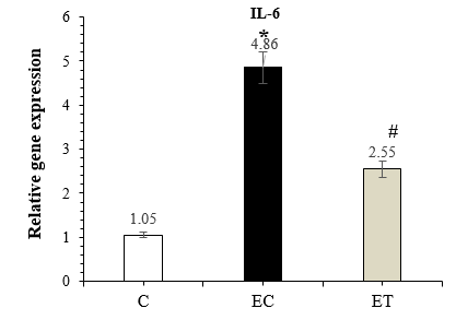 Figure 1. Comparison of IL-6 expression in the C, EC, and ET groups 48 hours after the last training session (Mean ± SD). * Indicates a significant increase in the EC group compared to the C group. # Indicates a significant decrease in the ET group compared to the EC group. Abbreviations: C: Control group, EC: Elderly Control group, and ET: Elderly Training group.