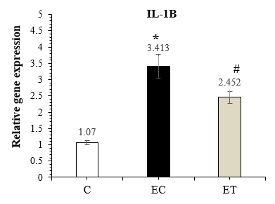 Figure 2. Comparison of IL-1β expression in the C, EC, and ET groups 48 hours after the last training session (Mean ± SD). * Indicates a significant increase in the EC group compared to the C group. # Indicates a significant decrease in the ET group compared to the EC group. Abbreviations: C: Control group, EC: Elderly Control group, and ET: Elderly Training group.