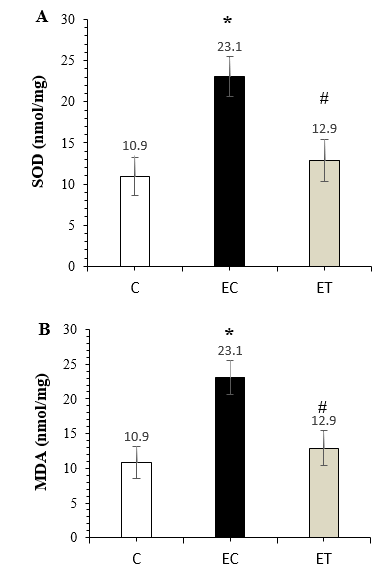 Figure 4. Comparison of SOD (a) and MDA (b) in the C, EC, and ET groups 48 hours after the last training session (Mean ± SD). * Indicates a significant difference in the EC group compared to the C group. # Indicates a significant difference in the ET group compared to the EC group. Abbreviations: C: Control group, EC: Elderly Control group, and ET: Elderly Training group.