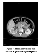Ultrasonography examination revealed an 81x68 mm cystic lesion behind the pelvis and adjacent to the bladder. Renal ultrasonography reported right renal hydronephrosis.