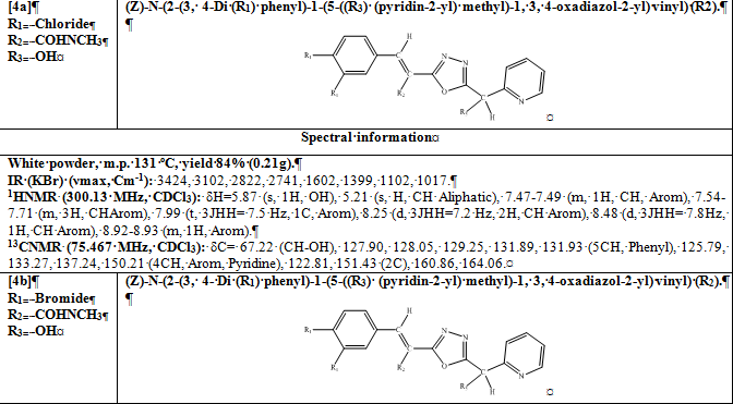 1, 3, 4-oxadiazole compounds were synthesized using a single-stage, high yield method. The chemical structure of all synthesized compounds was investigated using IR spectroscopy, H-NMR and C-NMR. First, N-Iso-cyan-imino-triphenyl-phosphoran (1mmol, 0.3 g) was dissolved in dichloromethane (7 ml) with 2-pyridine carbaldehyde. Next, carboxylic acid derivatives and cinnamic acid derivatives (1mmol) were added. The solution was stirred for 24 hours on a magnetic stirrer at 37 oC. The solvent was removed by evaporation, and the viscous residue was purified by flash column chromatography [silica gel powder: petroleum ether–ethyl acetate (5:1)]. Thin‐layer chromatography and NMR indicated that there was no side product.