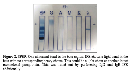 The diagnosis of monoclonal gammopathies depends on the identification of monoclonal immunoglobulins or M-proteins in the serum or urine. Techniques for the evaluation of serum M proteins include either gel- or capillary-based electrophoresis along with immunotyping (8). ‘M’ proteins can be detected as a single discrete band (M band) on an agarose gel and a prominent peak in the densitometer trace by SPEP/HRE. Serum IFE is considered to be the ‘gold standard’ technique in confirming paraproteinemia diagnosis.